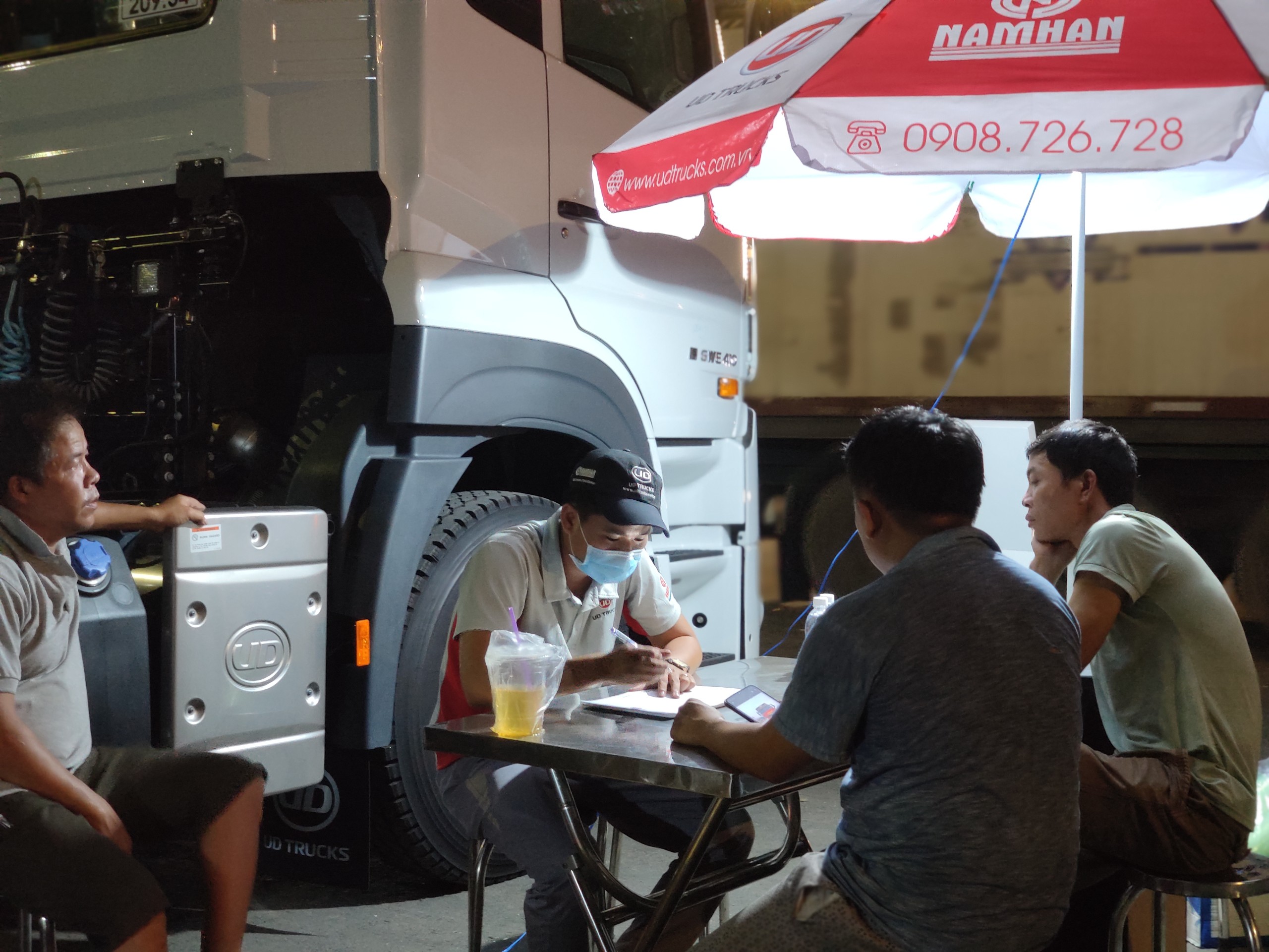 Nhân viên kinh doanh UD Trucks tư vấn cho khách hàng các mẫu xe.